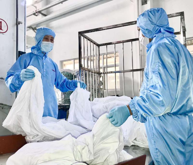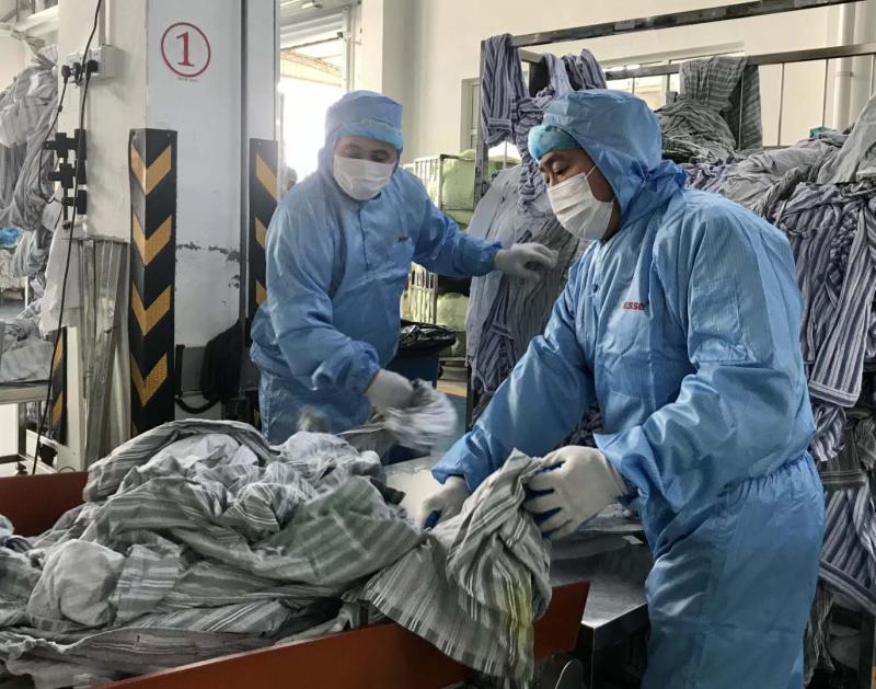 據(jù)他介紹,一方面,一般普通的臟污織物所經(jīng)歷的消毒包含洗滌過程中的化學消毒和濕熱消毒,以及干燥過程中的干熱消毒,通過利用隔離式洗衣機洗滌,幾輪化學加物理消毒下來,可以保障織物的清潔衛(wèi)生程度。對于重度污染的織物,甚至是感染性織物,消毒方式就更加嚴格了,無論從消毒劑的用量上,還是洗滌烘干的溫度上,都作了嚴的把控,以確保消毒質量。