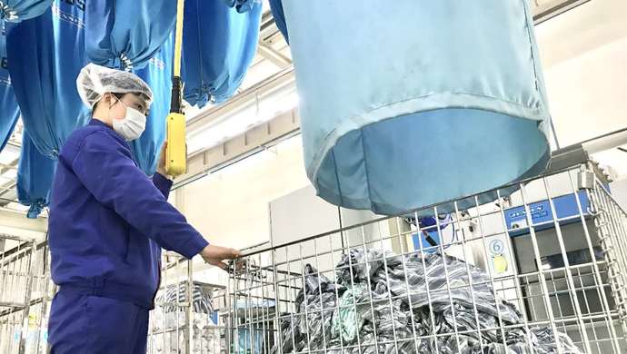 據(jù)他介紹,一方面,一般普通的臟污織物所經(jīng)歷的消毒包含洗滌過程中的化學消毒和濕熱消毒,以及干燥過程中的干熱消毒,通過利用隔離式洗衣機洗滌,幾輪化學加物理消毒下來,可以保障織物的清潔衛(wèi)生程度。對于重度污染的織物,甚至是感染性織物,消毒方式就更加嚴格了,無論從消毒劑的用量上,還是洗滌烘干的溫度上,都作了嚴的把控,以確保消毒質量。